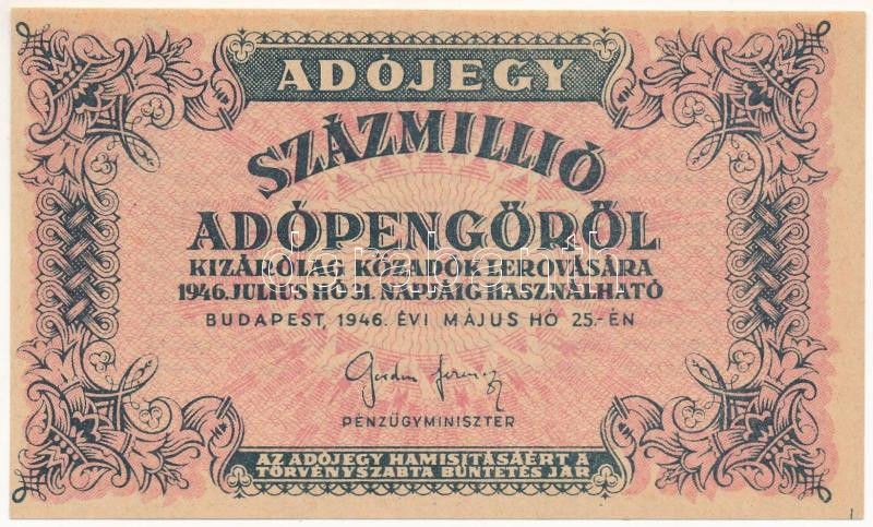 1946. 100.000.000AP vastagabb fehér papír T:AU / Hungary 1946. 100.000.000 Adópengő on thicker, white paper C:AU Adamo P55, Krause 142