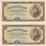 1946. 100.000.000P (2x) sorszámkövetők „P 325 044878 – P 325 044879” T:AU / Hungary 1946. 100.000.000 Pengő (2x) consecutive serials „P 325 044878 – P 325 044879” C:AU Adamo P27