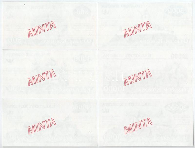 2012. 500K „Balatoni Korona” + 1000K „Balatoni Korona” + 2000K „Balatoni Korona” + 5000K „Balatoni Korona” + 10.000K „Balatoni Korona” + 20.000K „Balatoni Korona”, helyi pénzek, mindegyik csak hátlapi nyomat, előoldalukon piros „MINTA” bélyegzéssel T:UNC / Hungary 2012. 500 Korona „Balatoni Korona” + 1000 Korona „Balatoni Korona” + 2000 Korona „Balatoni Korona” + 5000 Korona „Balatoni Korona” + 10.000 Korona „Balatoni Korona” + 20.000 Korona „Balatoni Korona”, local money, all printed only on the back, with a red „MINTA (SPECIMEN)” stamp on the front C:UNC