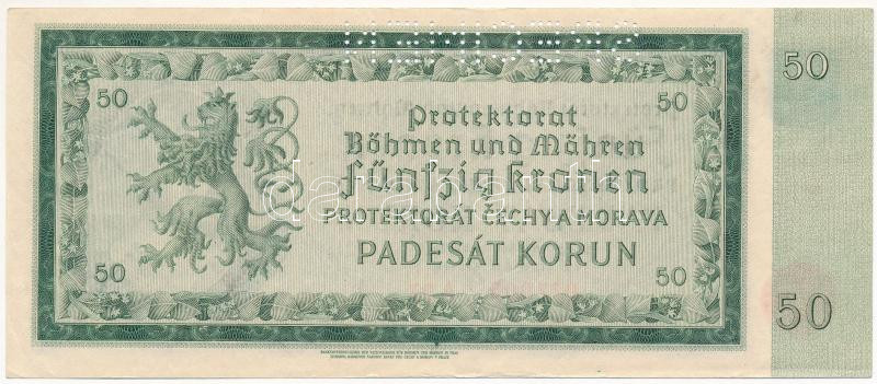 Német Harmadik Birodalom / Cseh-Morva Protektorátus 1940. 50K „A 07 027005”, „SPECIMEN (MINTA)” perforációval T:AU sarokhajlás / German Third Reich / Protectorate of Bohemia and Moravia 1940. 50 Korun „A 07 027005” with „SPECIMEN” perforation C:AU corner fold Krause 5.s
