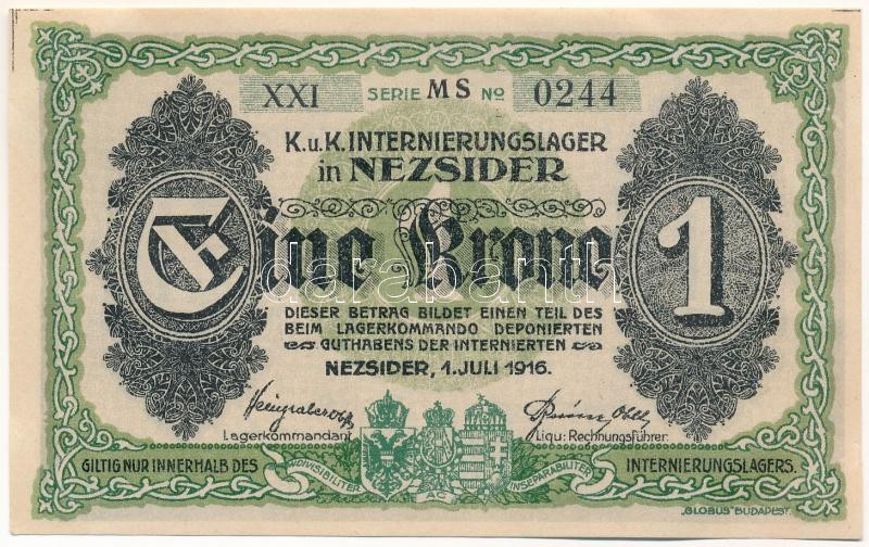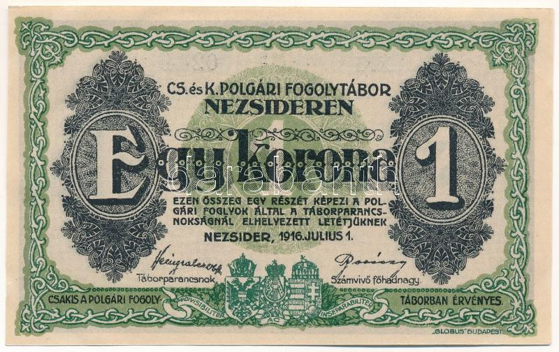 Nezsider / hadifogolytábor 1916. 1K római sorozat- és arab sorszámmal, „MS” jelzéssel T:AU / Hungary / Nezsider / POW Camp 01.07.1916. 1 Krone with Roman series and Arabic serial number, with „MS” C:AU Adamo HHE-1.3.3