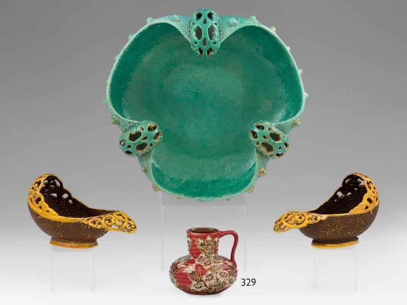 Kikiáltási ár: 48 000 FtPorcelánfajansz, áttört díszítéssel. Öblében elefántcsontszín alapmázon magastüzű, színes festéssel és aranyozással őszirózsák ábrázolása. Feltehetően Sikorski Tádé formaterve. Restaurált. Hátoldalán jelzett: masszába nyomott Zsolnay, Pécs és 3775 (1892.