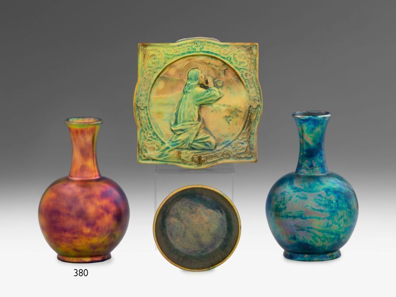 Kikiáltási ár: 160 000 FtPorcelán. Öblükben máz alatti festéssel Őri Ferenc és Őry Éva portréja. Férfiportrén ajándékozási felirat: "Martyn Őri Ferencnek", hátoldalán 1965. IV. 10. Zsolnay-gyár, Pécs, 1965. Martyn Ferenc saját kezű munkája. Átm.: 27,5 és 27 cm Analógia: Kovács Or