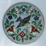 Átmérő: 27 cm, népies díszítésű, mázas cseréptányér (1910-1935), hátul masszába nyomott jelzéssel, korának megfelelő állapotban