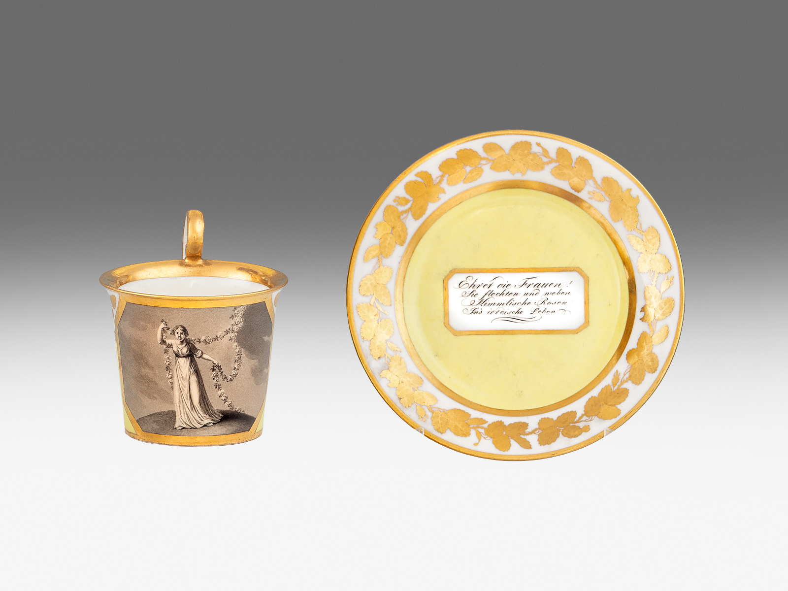 Porcelán, színesen festett és aranyozott. A csészén sárga fondon, aranykeretes medalionban szépia hatású alapon schwarzlot festéssel