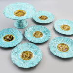 cca 1880 Villeroy & Boch női portrékkal díszített süteményes készlet. Talpas kínáló m: 14 cm, és 6 darab tál d: 20 cm. Jelzett, kis sérülésekkel, 1 tál ragasztott. /// Circa 1880, Villeroy & Boch Dessert Set with Female Portrait Decorations. Footed serving dish, height: 14 cm, and 6 plates, diameter: 20 cm. Marked, with minor damages, one plate repaired.