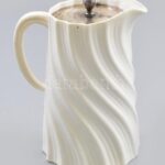 cca 1920 Hukin & Heath art nouveau csavart testű tejporcelán kancsó, címeres ezüstözött fém billenő fedéllel, félrehajló füllel. Mázrepedezett, alján és fedelén is jelzett, m: 20 cm