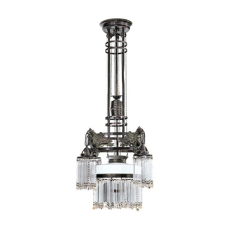 magyar, 1900 körül, sárgaréz, ötégős, tejüveg búrával, üvegcsüngőkkel, állítható magassággal, h: 128 cm