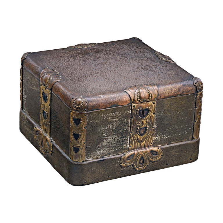 magyar, 1900 körül, fa korpuszon kalapált vörösréz borítással, belsejében bársony betéttel, kulcs nélkül, 20*31*31 cm