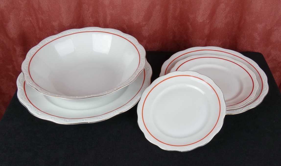 Étkészlet, KPM Rubens fantázianév, piros-arany festéssel (4 tálaló, 6 kistányér, 7 süteményes, 12 nagytányér, cukortartó, só-borstartó, fűszertartó)