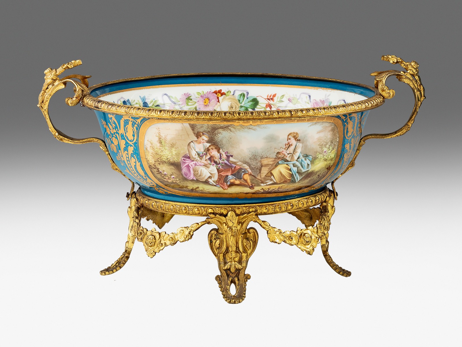 Aranyozott bronz foglalatban öblös porcelán tál, kétoldal ívelt fülekkel. Felületén kék fondon pasztózus aranyfestéssel festett virágokkal és levelekkel keretezett ovális medalion, benne aprólékosan megfestett romantikus jelenet, ill. hátoldalán és öbléb