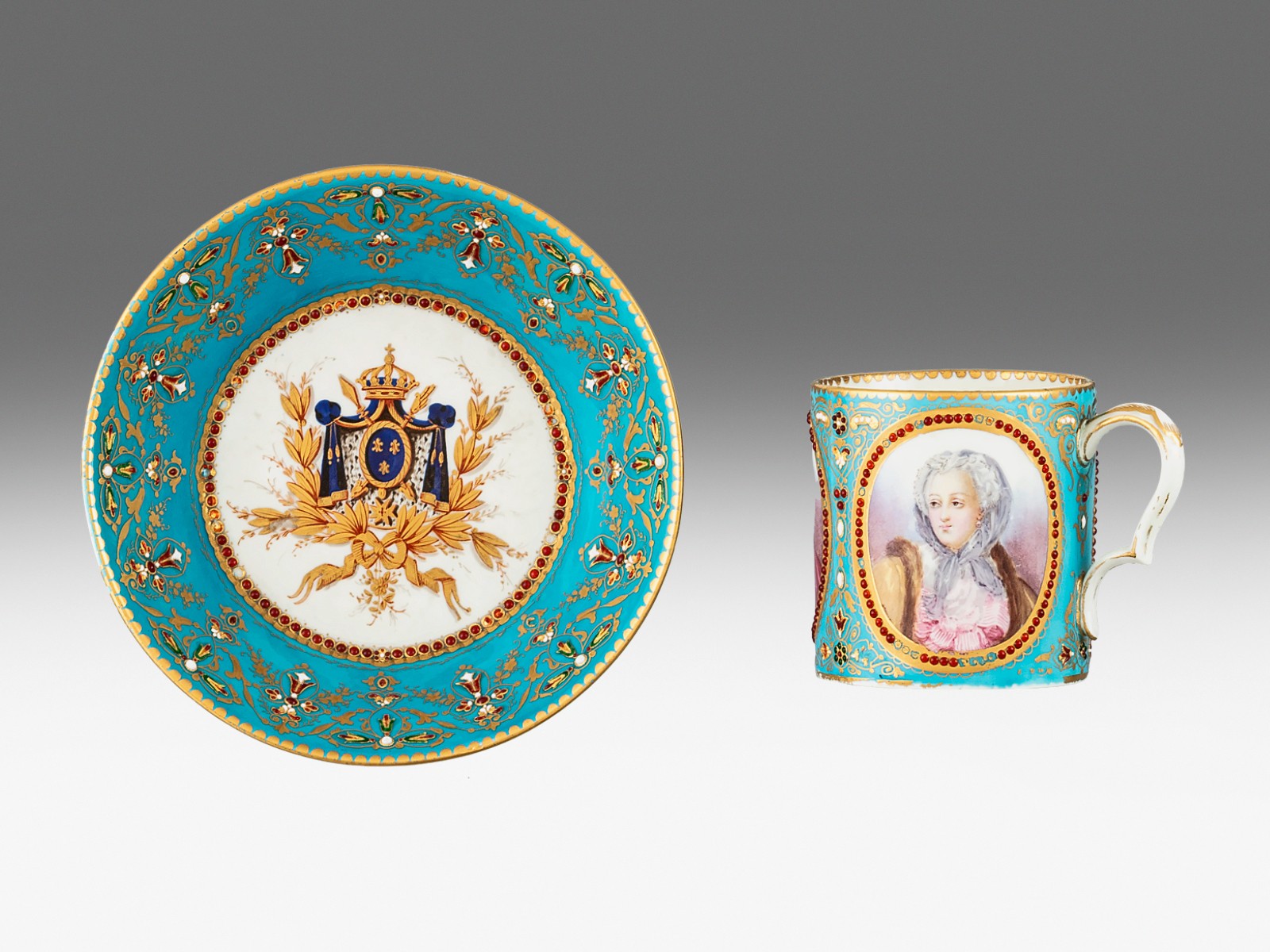 Porcelán. Csésze palástján türkizkék fondon pasztózus aranyfestéssel és zománccal festett, ismétlődő historizáló motívumok között medalionban XV. Lajos, Madame Pompadour és Leszczy’nska Mária francia királyné portréival. Aljának peremén frízben körbefutó