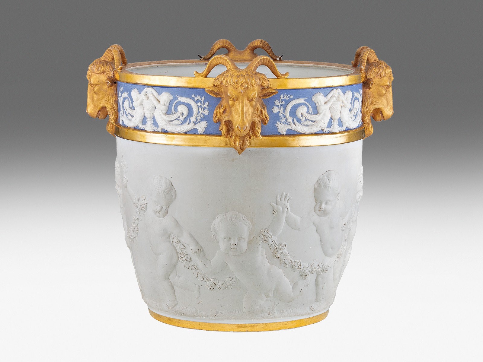 Bisquit porcelán. Aranyozott kosfejekkel és reliefszerűen kidomborodó, virágfüzérek között játszadozó puttókkal díszített,