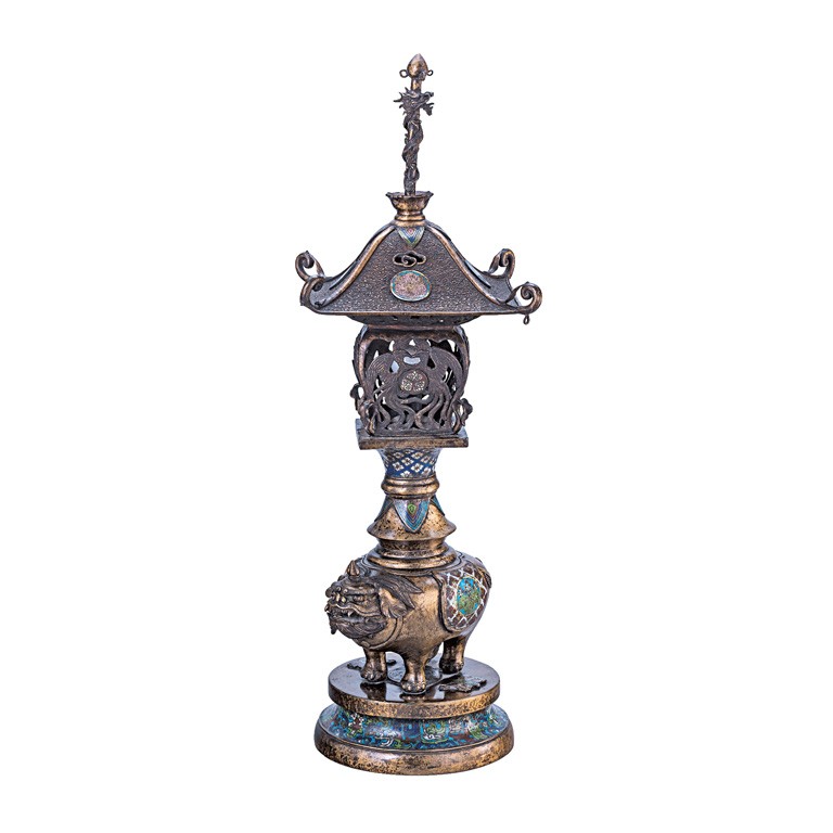 Japán, Meiji- periódus( 1868 – 1903) bronz, színes rekeszzománc díszítményekkel, talapzatán plasztikus Fo oroszlánnal, lámpává alakított, áttört, felső rész főnixmadarakkal díszítve, kis sérülésekkel, m: 91 cm