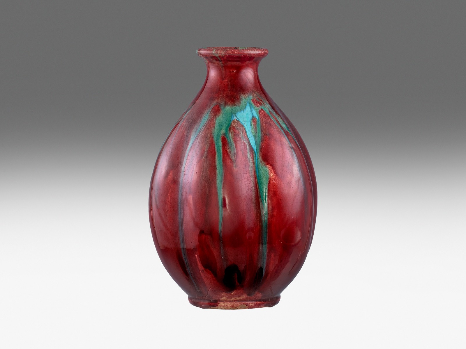Gádor István – 2 darab art deco váza Korongozott és kézzel formált kerámia. Gerezdelt formájú váza sötétbarna alapmázán színesen festett, lefolyó (ún. coulé) és csillogó adventurinmázzal borítva. Szájperemén apró restaurálás. Alján festett GÁDOR 1925. jel