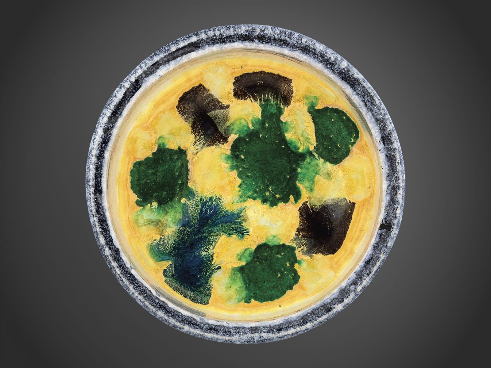 Samottos kerámia, színes üvegmázakkal festve. mázakkal. Hátoldalán festett Gádor jelzéssel. 1962-72 között. Átm.: 21,5 cm