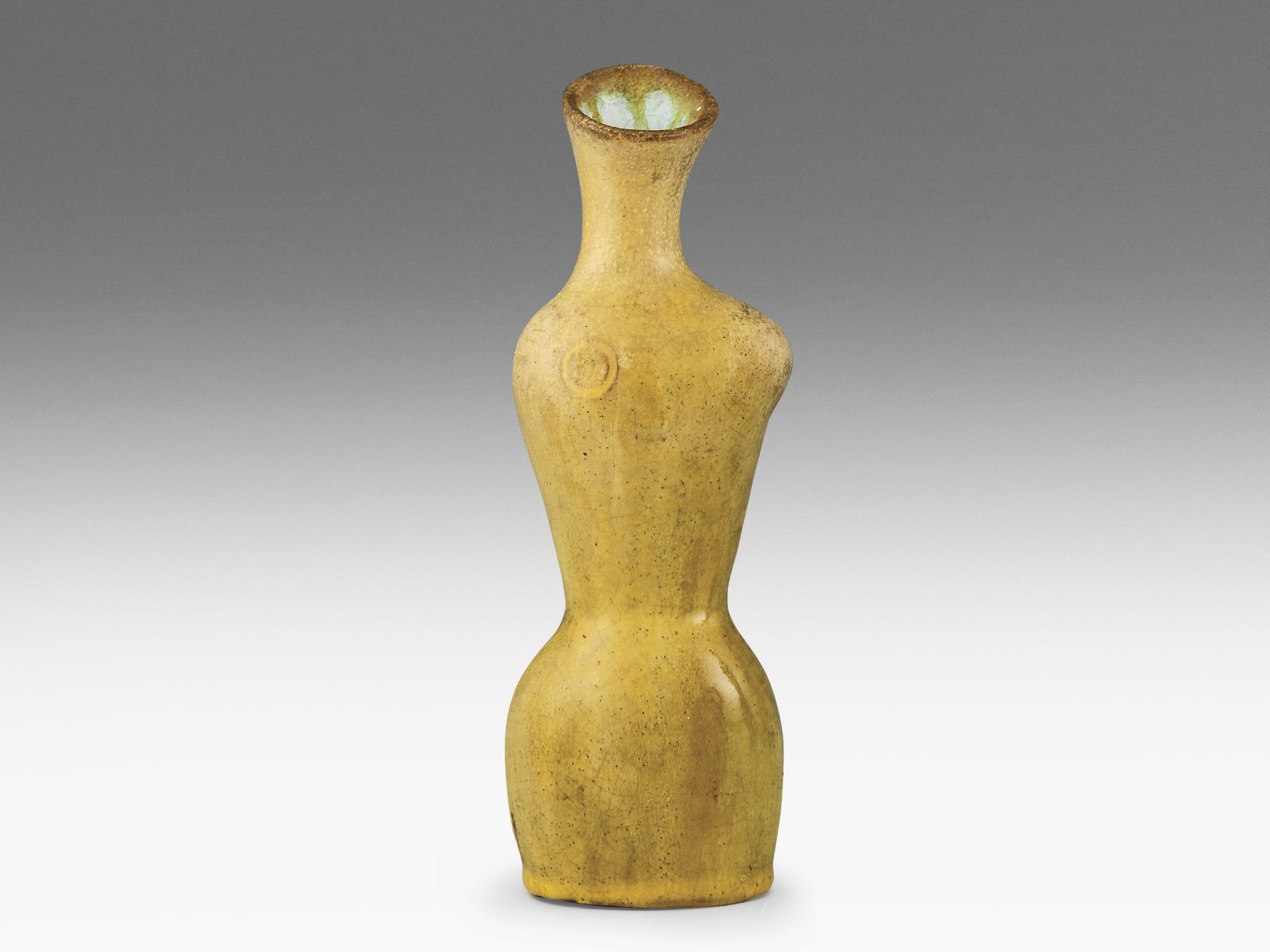 Kikiáltási ár: 300 000 FtFormába öntött fehércserép, felületén selymesfényű, többrétegű, színes eozinmázakkal festve. Formaterv: Sinkó András, 1935. Alján jelzett: bélyegzett hárompajzsos öttornyos márkajelzéssel. Zsolnay, Pécs, 1930-as évek vége. M.: 16 × 8,5 × 9 cm