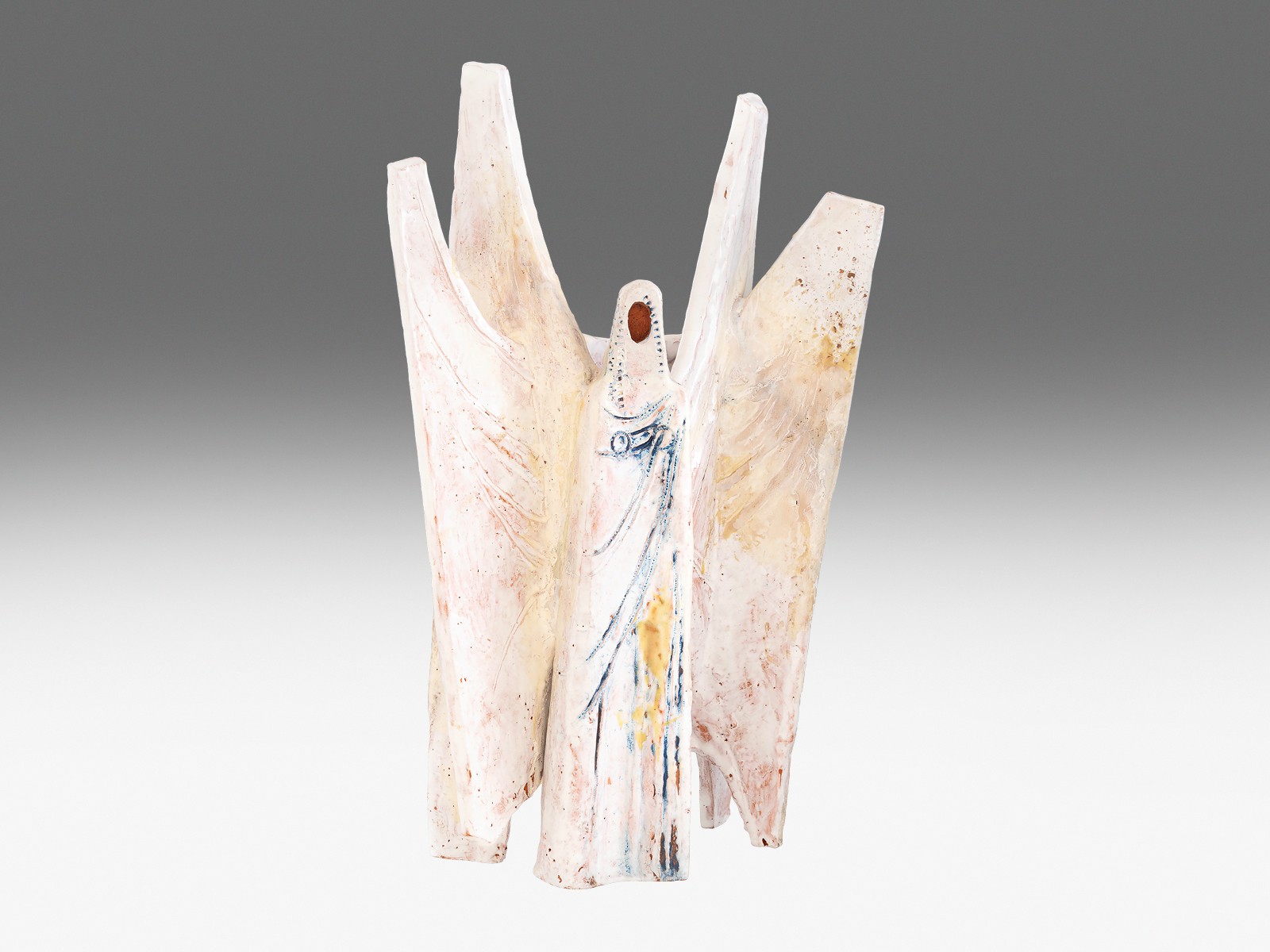 Garányi József (Budapest, 1928 – 2015) Angyal Kézzel formázott vörös cserép. Szárnyas angyal figura színes mázakkal festve. Egyik szárnya restaurált. Hátoldalán masszába karcolt Garányi jelzéssel. 1980-as évek. M.: 36 cm