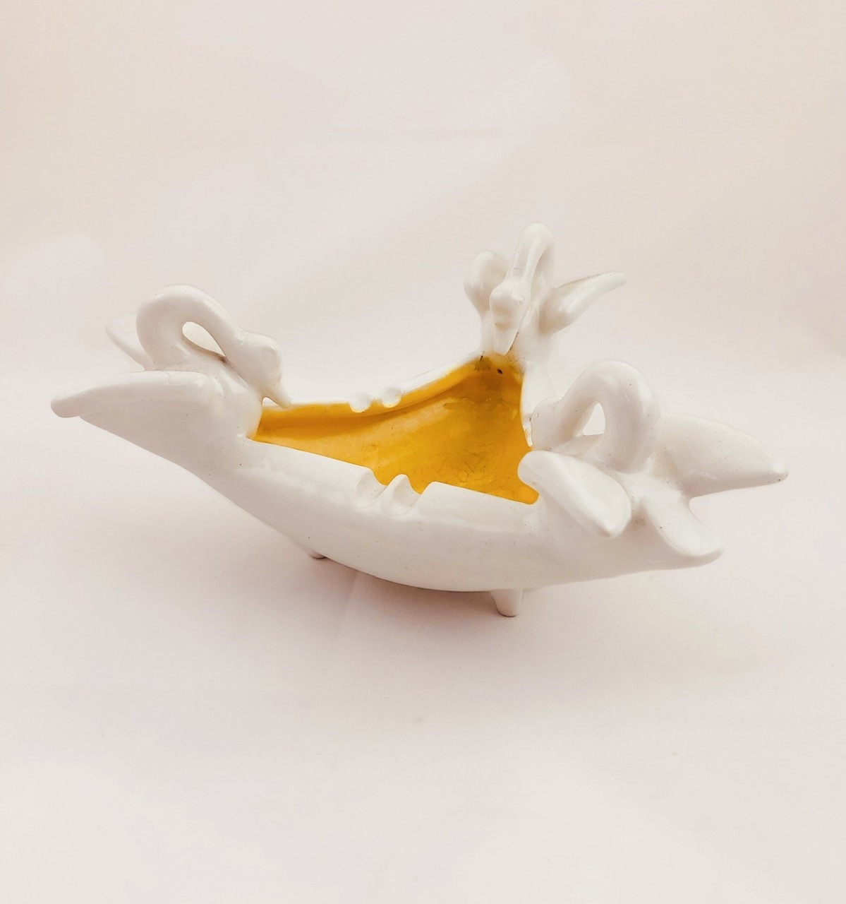 Fehérmázas cserép, kézzel formába préselt, belseje mustársárga mázzal, Magasság: 10,5 cm, szélesség: 16 cm, Jelzés: masszába karcolt Gorka