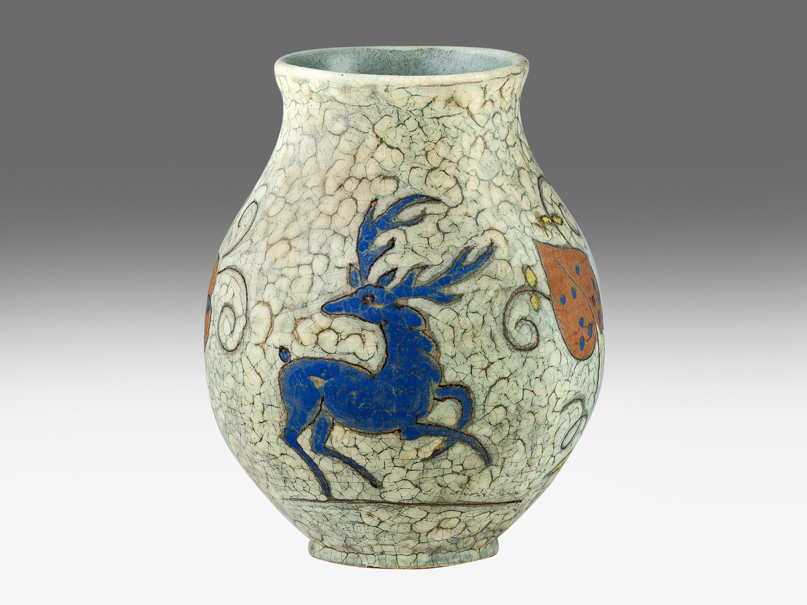 Gorka Géza (Nagytapolcsány, 1894 – Nógrádverőce, 1971) Váza, szarvasmotívummal Korongozott és kézzel formált fehércserép. Kétrétegű, nyersfehér és szürke összeugró mázas, írókázott barna kontúrral. Barna, sárga és kék festéssel, sgraffito technikával dís