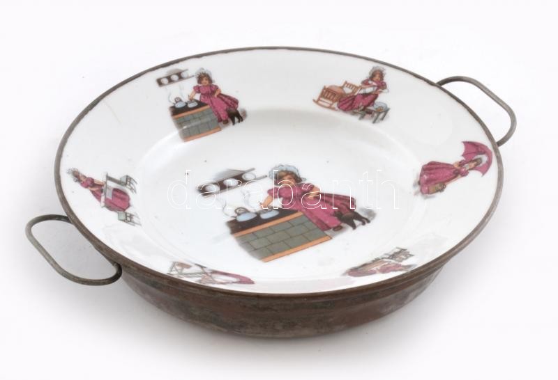 Gyermek tányérmelegítő, porcelán, réz. Tányéron kis hajszálrepedésekkel, kopásokkal, jelzés nélkül. d: 22 cm