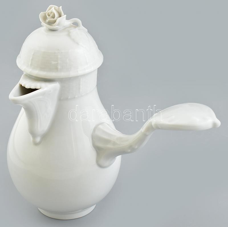 Herendi nyeles kiöntő, rózsás fedéllel. Fehér mázas. Kézzel festett, jelzett, hibátlan. m: 19 cm<a href="https://www.darabanth.com/hu/gyorsarveres/423/kategoriak~Porcelan-keramia-uveg/Porcelan~27/Herendi-nyeles-kionto-rozsas-fedellel-Feher-mazas-Kez