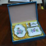 Festett, mázas porcelán, cigarettás doboz, hamutál, gyufatartó, parázsnyomó.