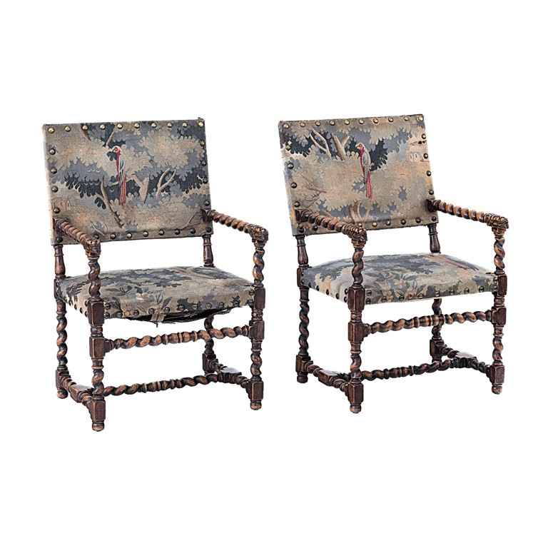flamand, 19. sz., tömör diófa, faragott és esztergált díszítéssel, gobelin kárpitozása sérült, 103*69*56 cm