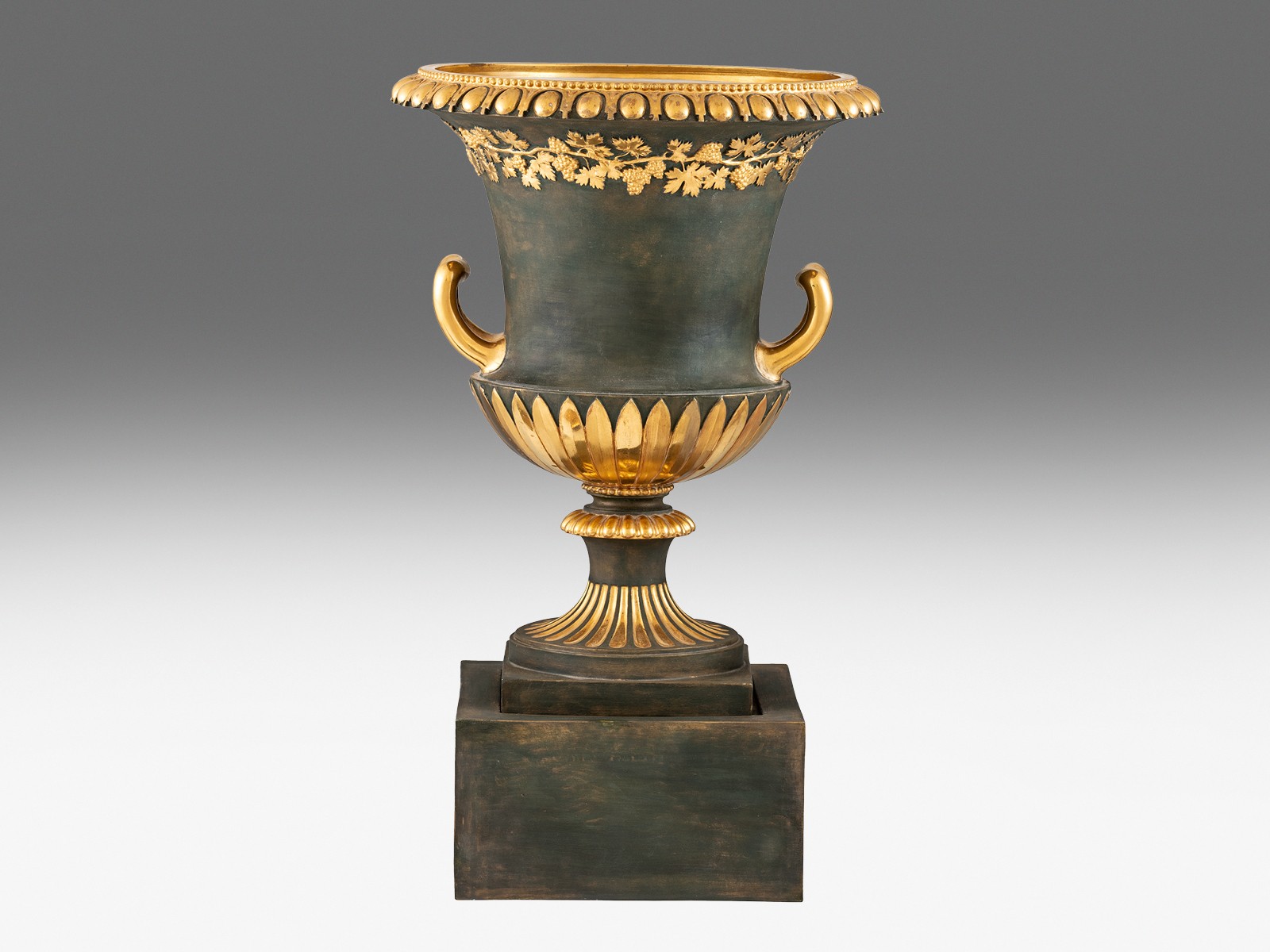 Zöld bársony hatású festett porcelán, plasztikusan kiemelkedő, domborodó díszítésén dús aranyfestéssel. Eredeti posztamense mázrepedt. Restaurált. Alján jelzett: masszába nyomott F és 814, valamint máz alatt kobalttal festett méhkas. Bécs, 1814. M.: 44 cm