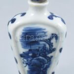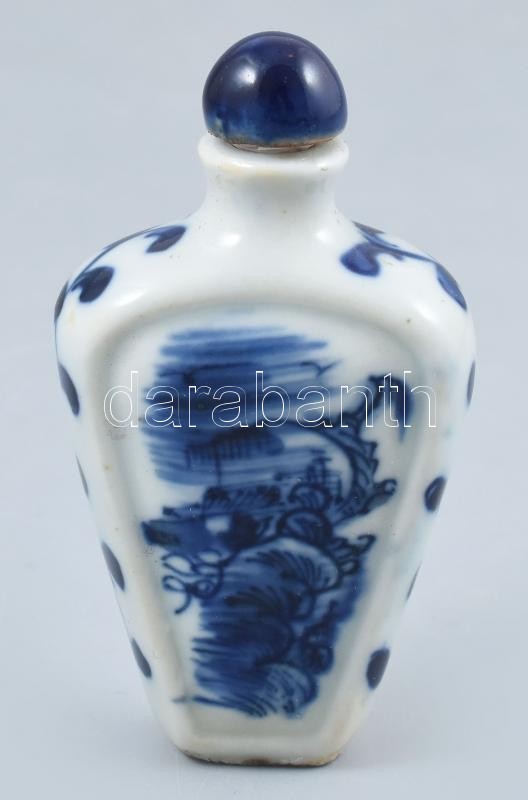 Kuangxi kék-fehér mintás kínai porcelán illatszeres palack, kézzel festett, kis kopásnyomokkal, jelzett, m: 7 cm<a href="https://www.darabanth.com/hu/gyorsarveres/424/kategoriak~Porcelan-keramia-uveg/Porcelan~500006/Kuangxi-kek-feher-mintas-kinai-po