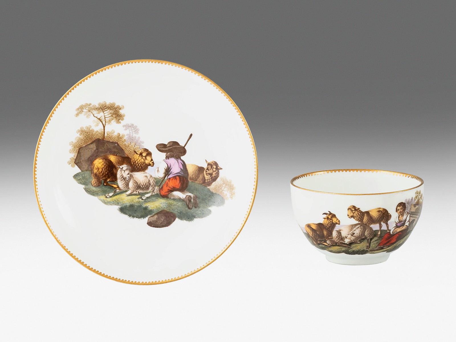 Porcelán, színes festéssel, aranyozással. Tálka öblében és csésze oldalán színesen festett romantikus pásztorjelenet, csésze öblében festett mezei virágcsokor. Csésze oldalán csavart mintázatú, kettős füllel. Aljukon jelzett: máz alatt kobalttal festett