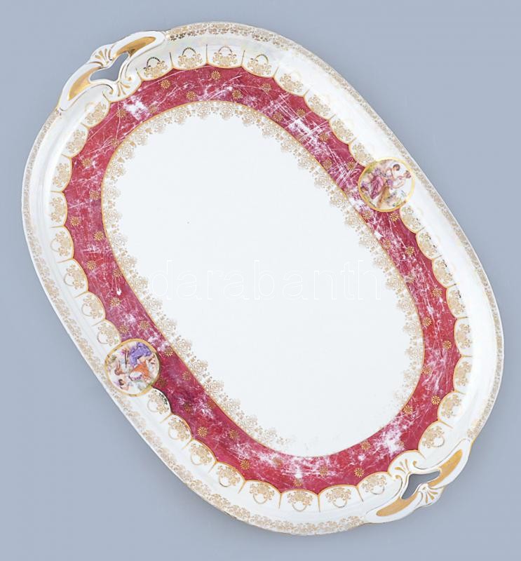 Moritz Zdekauer nagy méretű kínáló tálca, mitológiai jelenettel. Matricás, jelzett, kopással. 46×32 cm<a href="https://www.darabanth.com/hu/gyorsarveres/424/kategoriak~Porcelan-keramia-uveg/Porcelan~500006/Moritz-Zdekauer-nagy-meretu-kinalo-talca-mi