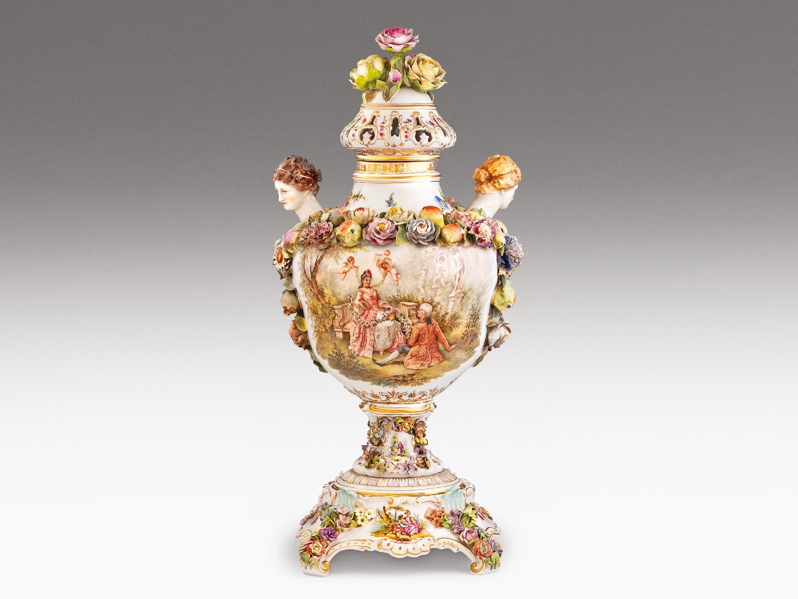 Német rokokó díszurna Színesen festett és aranyozott porcelán. Talapzatán, talpán, vázán és a fedélen plasztikus gyümölcs-és virágdíszek. Palástján aprólékosan megfestett idillikus jelenet elszórt virágdíszekkel, váza két oldalán női fejek. Áttört, leem