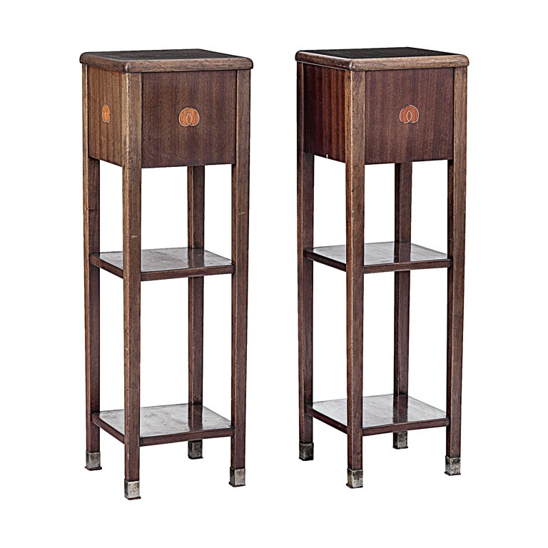 magyar, 1910 körül, tömör mahagóni és mahagóni borítással, fém intarziával és papucsokkal, kis sérüléssel, 110*34*34 cm