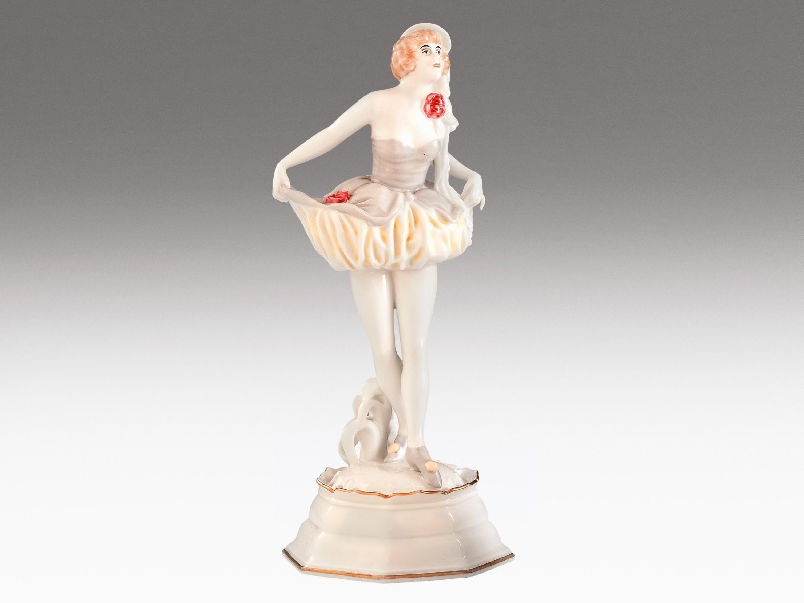 Rosenthal kisplasztika – Táncosnő Színesen festett porcelán. Dorothea Charol modellje. Alján jelzett: máz felett zölddel bélyegzett márkajelzés. Rosenthal, Selb, 1920-as évek. M.: 27 cm