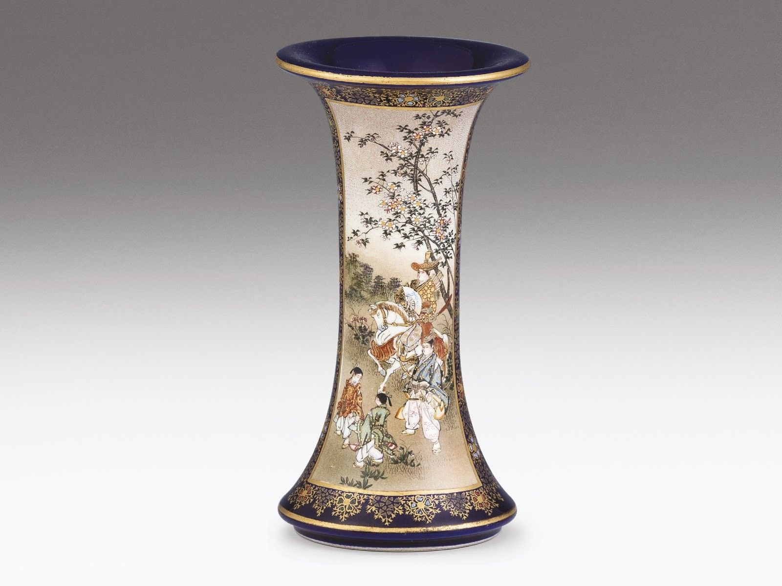 Keménycserép. Sötétkék alapon zománccal festett virágdíszek, valamint aranyozással keretezett mezőben színesen festett japánkert részlete galambokkal, másik oldalán vadászjelenet, lovon ülő nemes kíséretével.