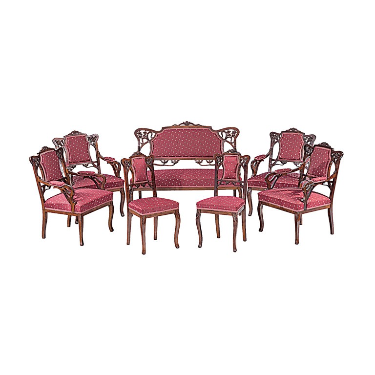 magyar, 1900 körül, tömör bükkfa, faragott díszítéssel, felújított, kis sérüléssel, karszék: 94,5*63*56 cm, támlásszék: 96*45*40 cm, kanapé: 101*128*56 cm,