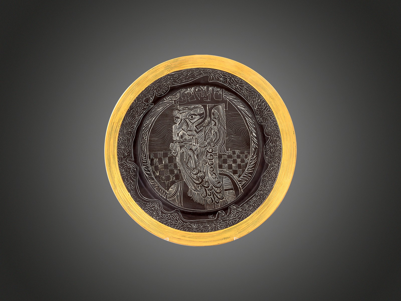 Szász Endre – Szent László falitányér Porcelán. Öblében fekete mázzal festett és visszakarcolt technikával kialakított Szent László arckép, leveles-szalagdíszes peremmel, ill. mattarany peremszéllel. Öblében karcolt Szász jelzéssel. Egyedi darab, sorozatg