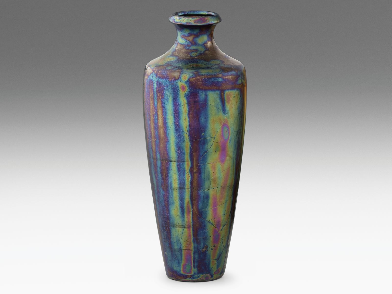 Szecessziós díszváza Fehércserép, irizáló felületén többrétegű, kraklés, lefolyó, színes eozinmázakkal festett, részben savmaratott. Alján masszába karcolt számok: 7122 és 54 (?). Feltehetően cseh, 1900 körül. M.: 25 cm