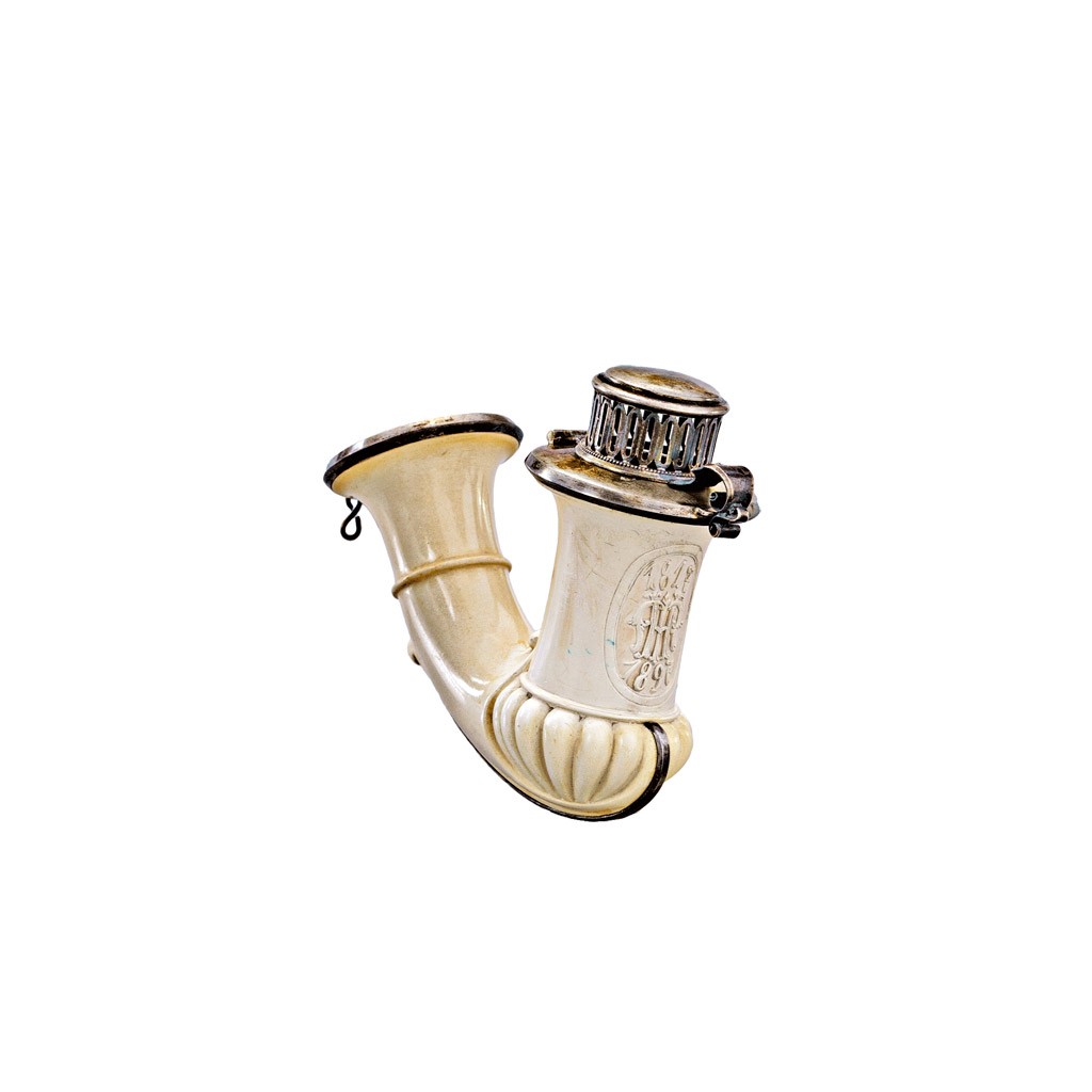 Bécs, 19. sz. vége, faragott tajték, 1817-1897 évszámmal és H.M. tulajdonosi monogrammal, ezüst szerelékén 1872-1922 közötti, bécsi 900 ezrelékes ezüst fémjel, "PR" mesterjegy, eredeti tokján: "Ludwig, Hartman und Eidan, Wien" jelzet