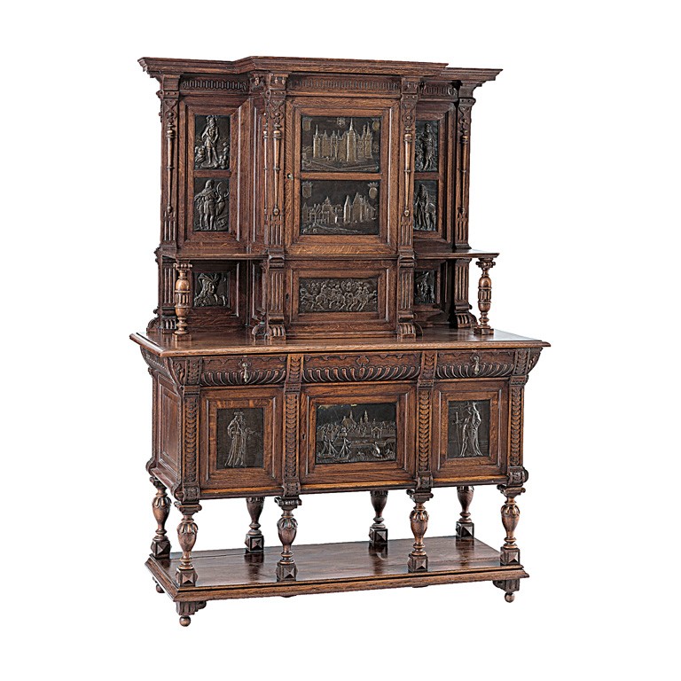 Nyugat – Európa, 1900 körül, tölgyfa, faragott és esztergált díszítéssel, domborított vörösréz plakettekkel, 209*146*60 cm
