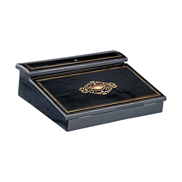 osztrák, 19. sz. vége, lakkfestett fa, réz és gyöngyház berakással, lenyíló kék bársonnyal borított írólappal, tolltartóval és 2 db tintatartóval, rekeszekkel, kulcs hiányzik, 10*33*26,5 cm