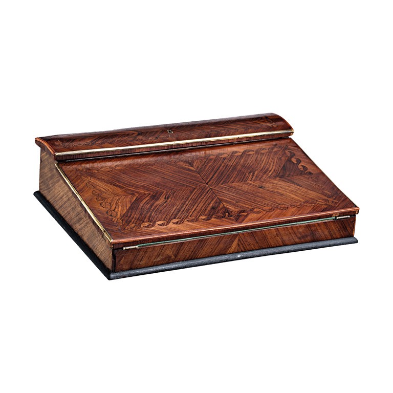 francia, 1900 körül, "TAHAN" jelzettel, mahagóni borítással, lehajtható írólapon zöld posztóval, ceruza-tolltartó rekesszel, intarziával, kulcs nélkül, 9*35,5*26 cm