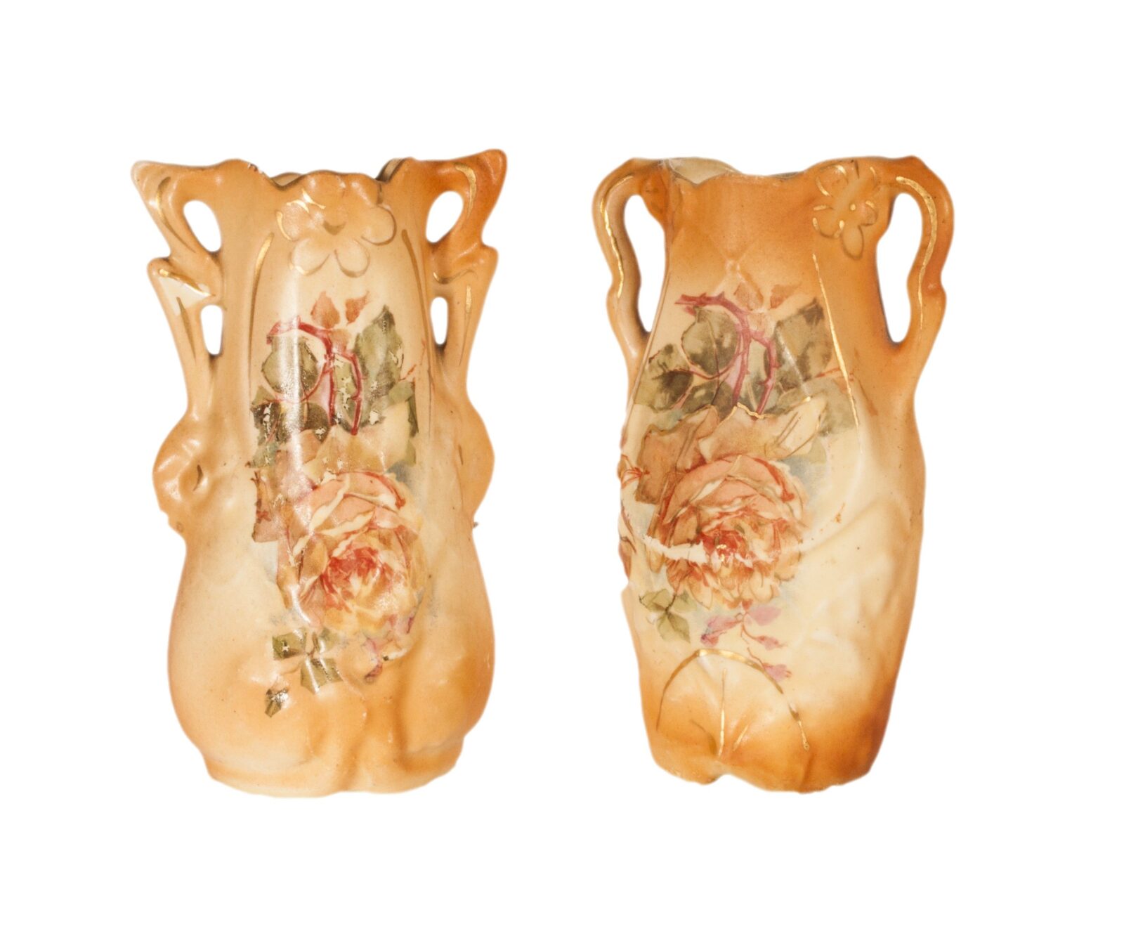 Mázas keménycserép. Szecessziós stílusú, kétfüles vázapár, levonóképes rózsa ábrázolással, hátoldalán krizantém motívummal (nem tökéletesen egyforma a két váza). 1900. körüli. Magasság: 14 cm