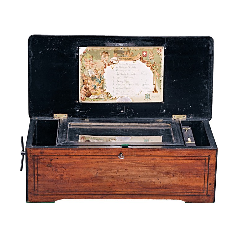 Svájc, 1870 körül, feketére festett és diófa borítású tokban, intarziás díszítéssel, 10 dallamot játszó működő zeneszerkezettel, kulccsal, felújított, 16*47*22 cm