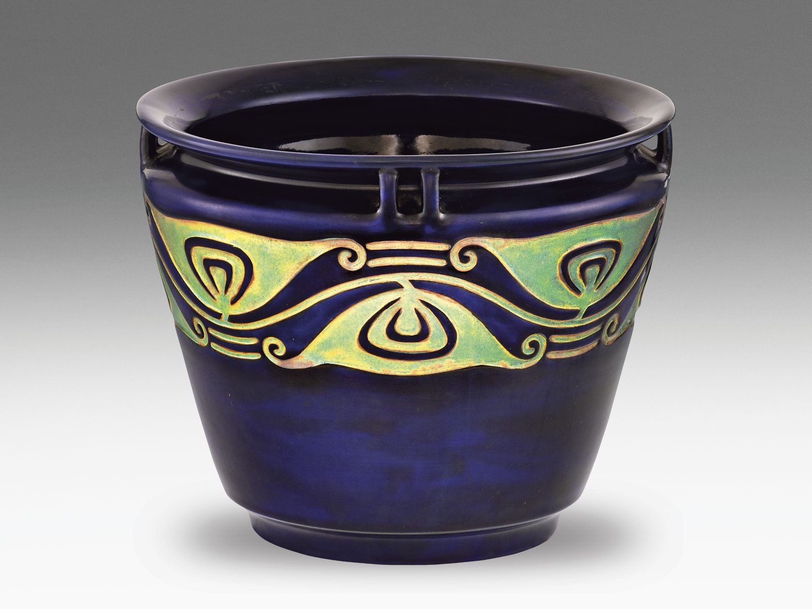 Formába korongozott fehércserép. Felületén magas tüzű, sötétkék alapmázon savmaratott, zöld eozinmázakkal festett, mélyített geometrikus motívumok (intarsia-technika). Egyik kettős fül díszítményen apró restaurálás.