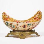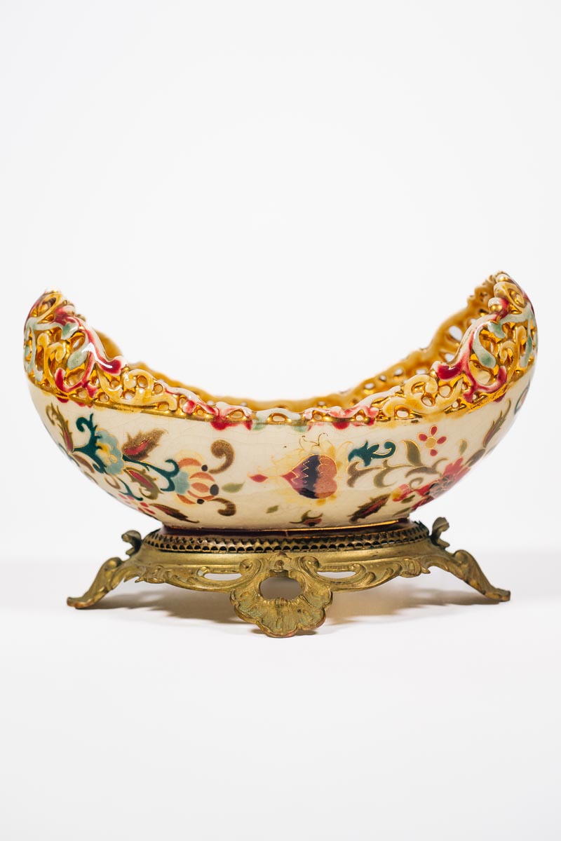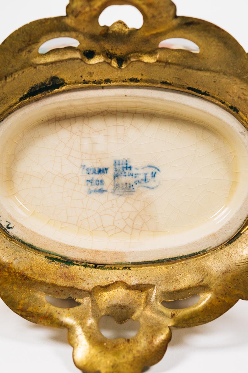 Zsolnay manufaktúra, 13,5 x 21 x 12 cm, Porcelánfajansz, áttört – díszfestett palásttal bronz talpazatba foglalva, 1880-1890