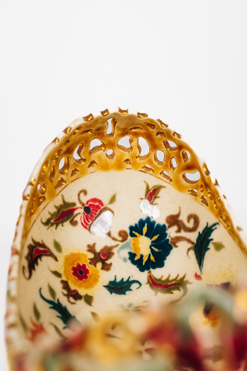 Zsolnay manufaktúra, 40 x 20 cm, Porcelánfajansz, plasztikus fülformázás, áttört talpazat, kecses formakorongozás, orientális motívumokkal díszfestve, 1885-1890