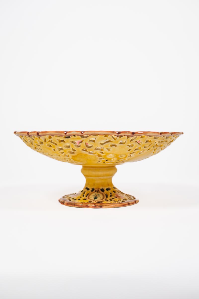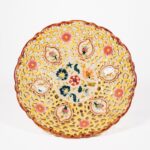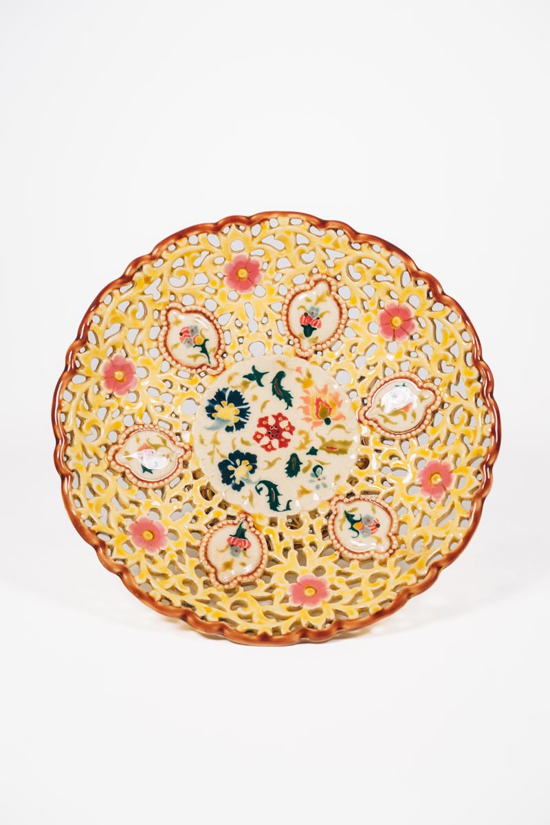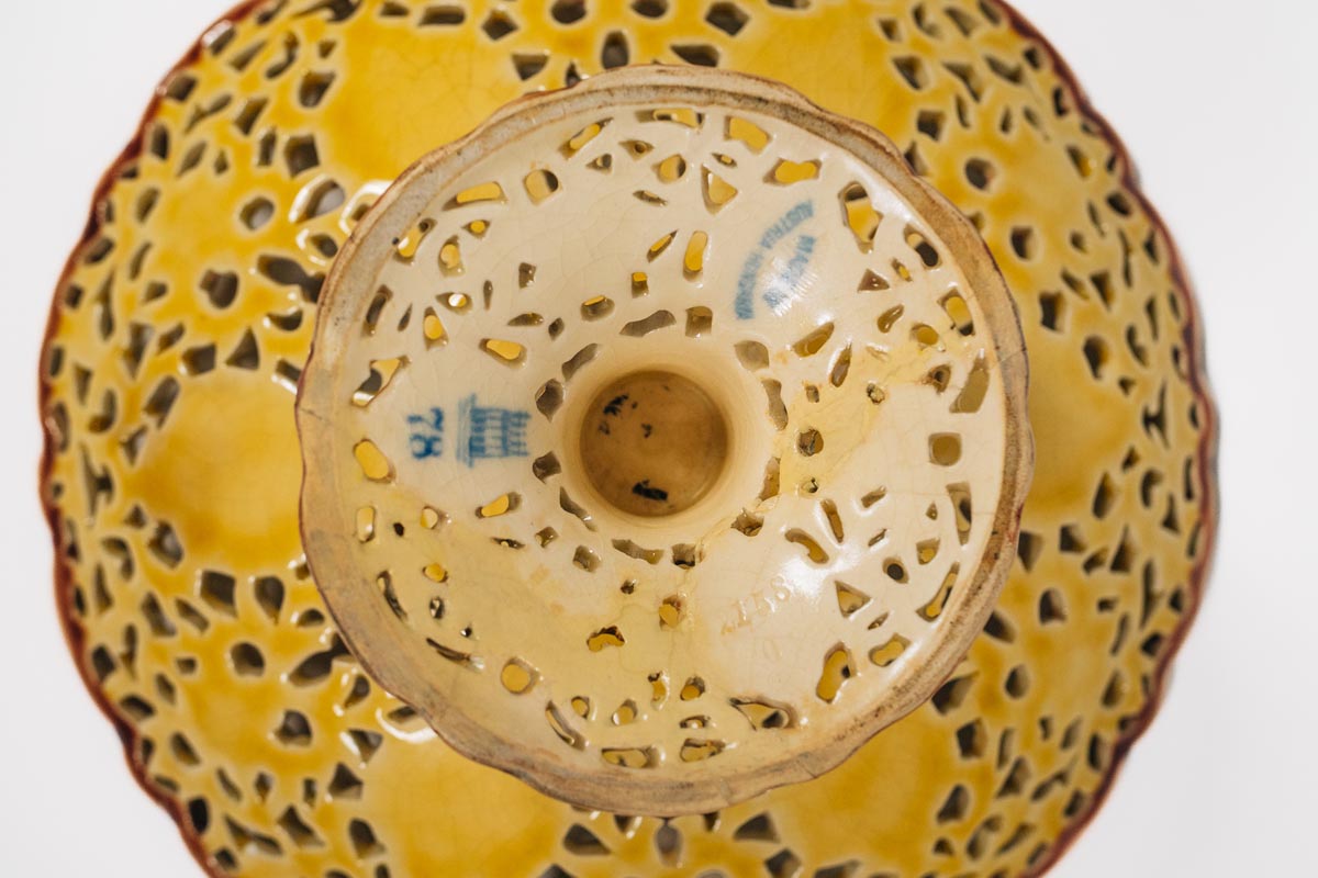 Zsolnay manufaktúra, 9 x 22 cm, Porcelánfajansz, korongozott forma áttört palásttal és diszfestéssel, 1873 – 1882