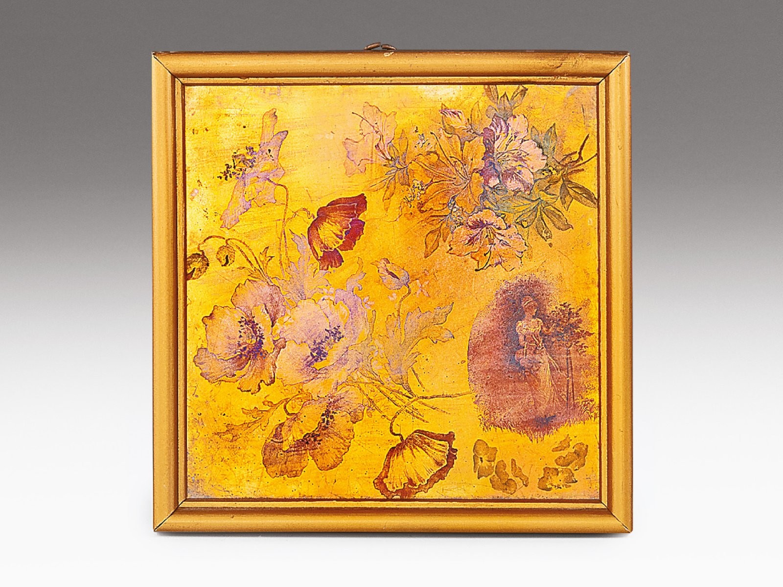 Zsolnay díszcsempe Felületén matricás lapon szecessziós dekor, aranyozva. Hátoldalán jelzett: Zsolnay V. Pécs, 1900 körül. M.: 15 × 15 cm